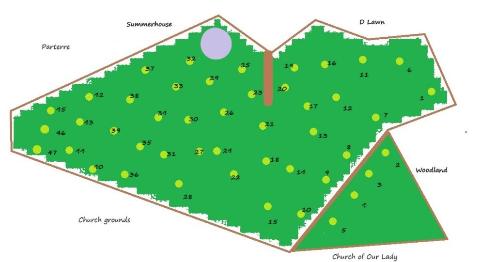 Tree 1 (the big holly) is at the entrance from the D Lawn in the formal gardens. You’ll see the trees are numbered right to left in rows as you go further in, all the way to Tree 46 in the south-west corner (it’s the rather splendid Colorado fir).